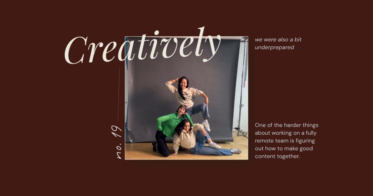 One of the harder things about working on a fully remote team is figuring out how to make good content together. Not just more content, because lord knows that no one is starving for output, but work that we can be really proud of. We’re all swimming in content all day, every day. We’ve adapted to scrolling past hundreds of pieces faster than we can register what we’ve just seen. At a certain point, the volume of output is just more noise added to the feed. It starts to feel numbing. And I can already sense that people are craving for more flavor. Like they have a high bar of good, and it would take a lot to convince them to stop their thumbs.