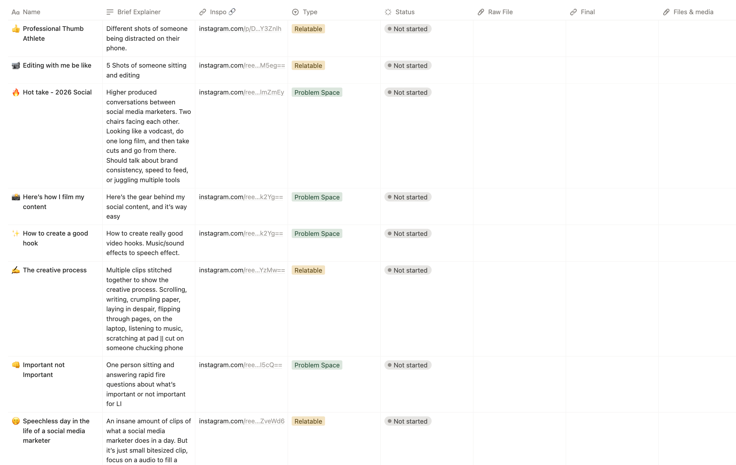 Creatively, we were also a bit underprepared. We had an ideas page and inspiration references, but they were built for day-to-day social execution, not for higher-production shoots. We hadn’t fully flushed out scripts for the pieces that needed structure, which meant we spent too much time massaging lines and improvising on the fly. In hindsight, we should have come in with clearer goals for each piece and been stricter about timeboxing.
